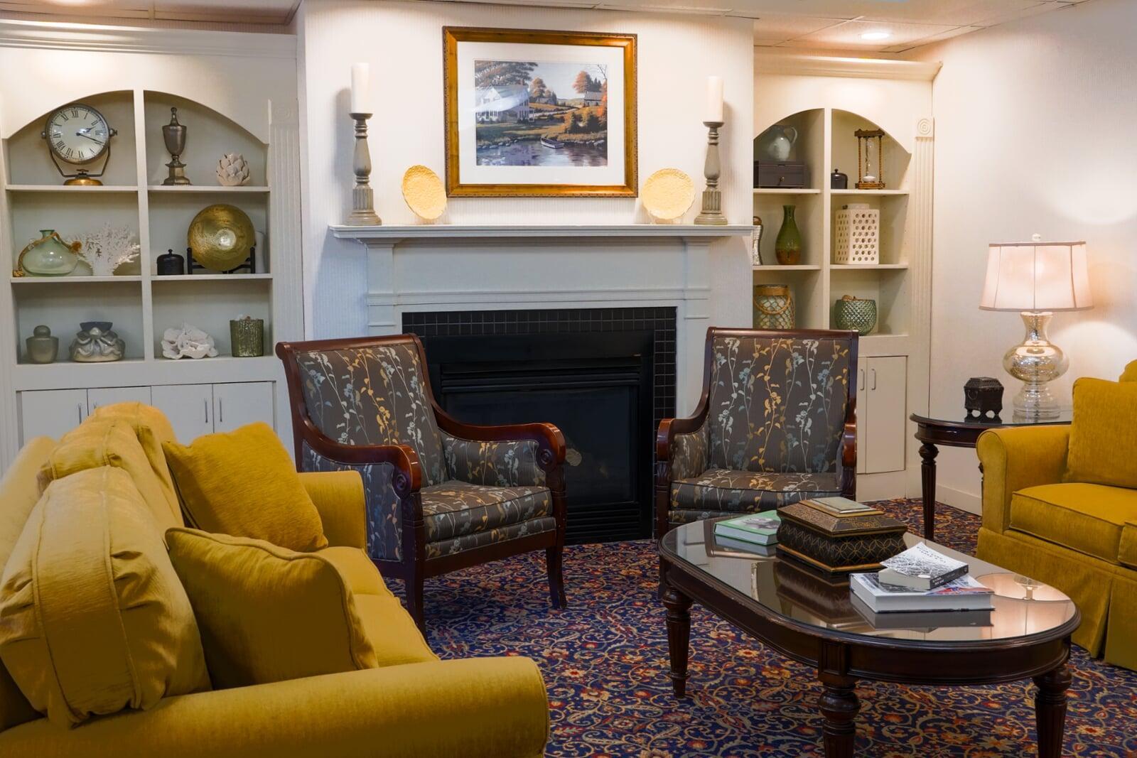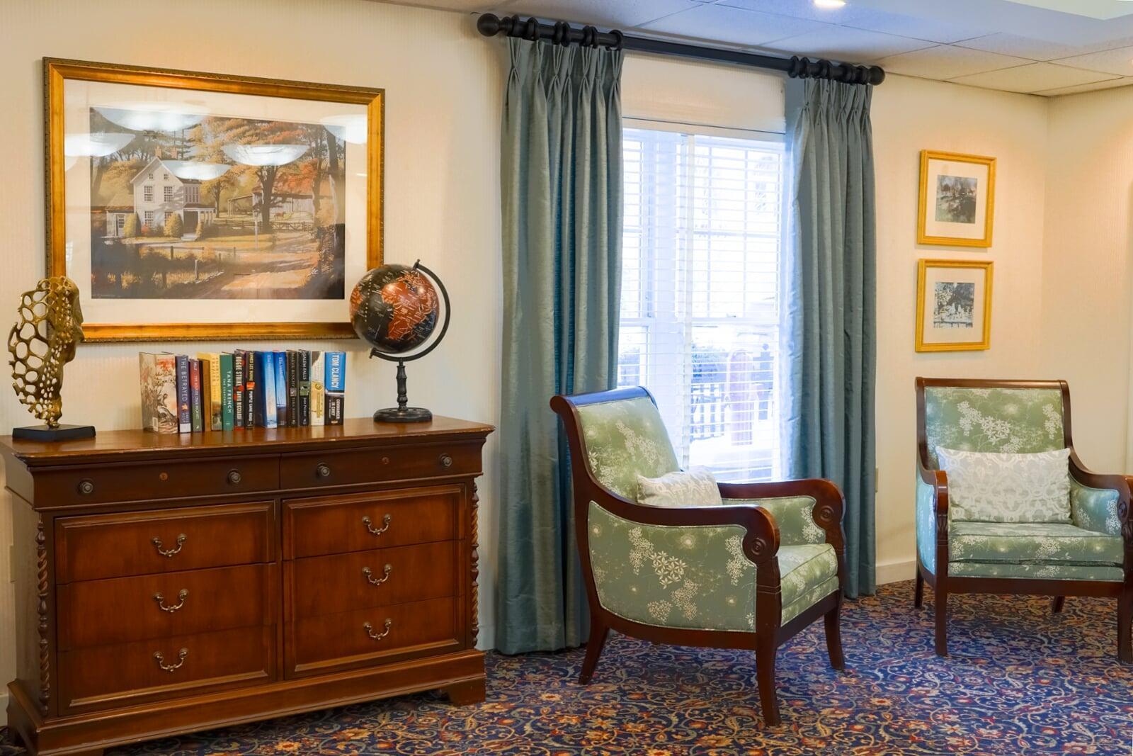 The downstairs living room is a bright, comfortable space where residents can gather to read, chat, or simply relax in a home-like setting.