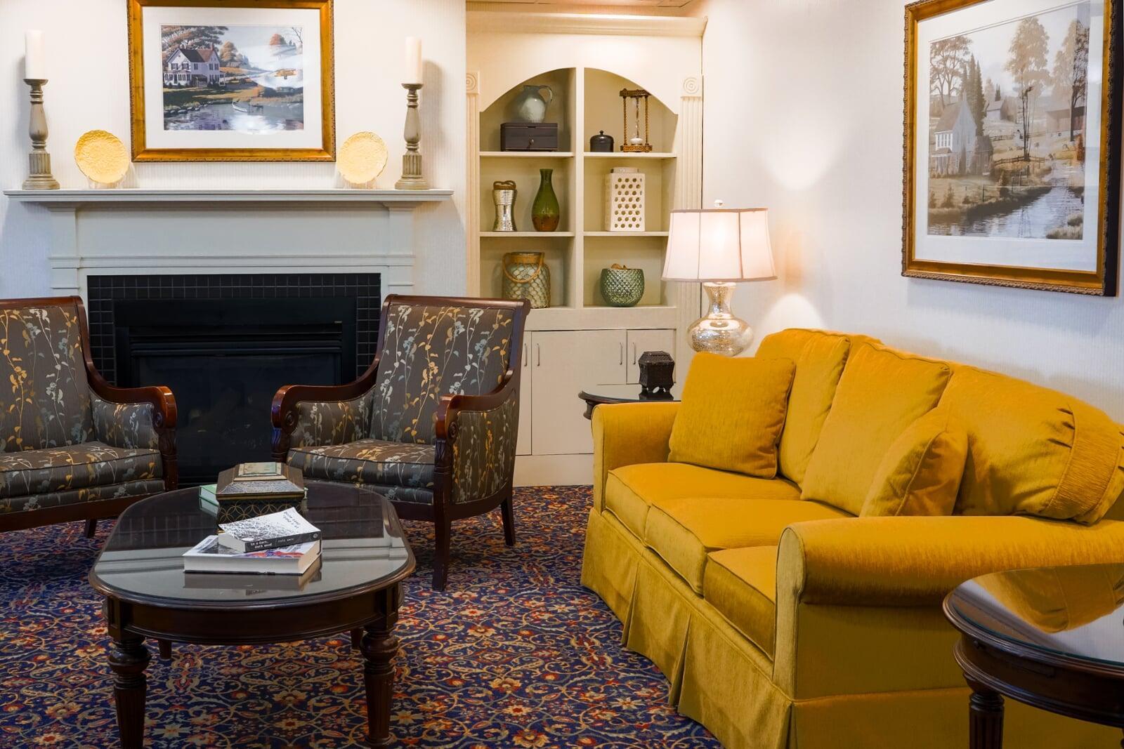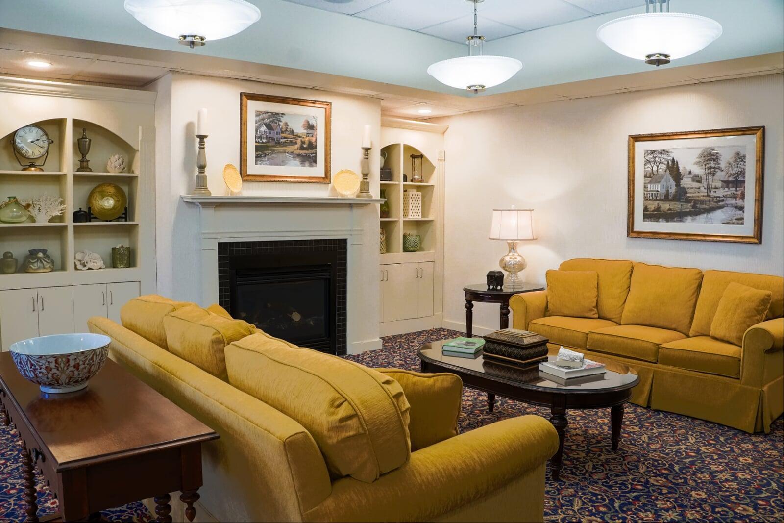 The downstairs living room is a bright, comfortable space where residents can gather to read, chat, or simply relax in a home-like setting.