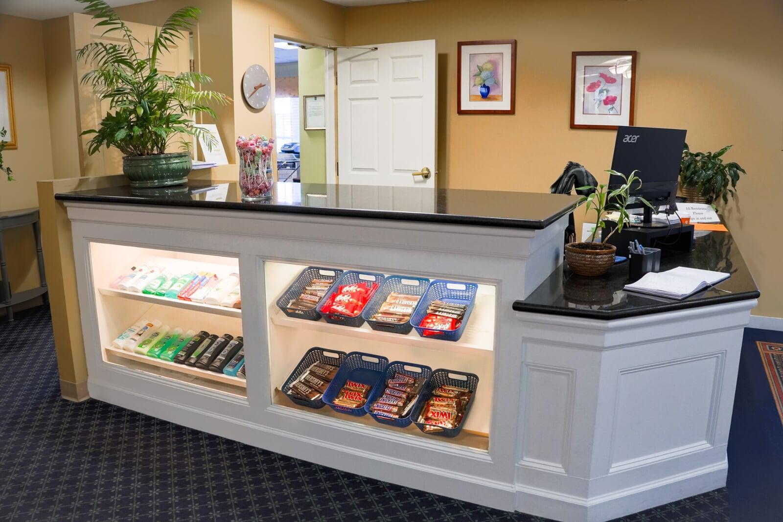 At the front desk, you’ll find a friendly welcome—and a small convenience store stocked with treats, toiletries, and everyday essentials.
